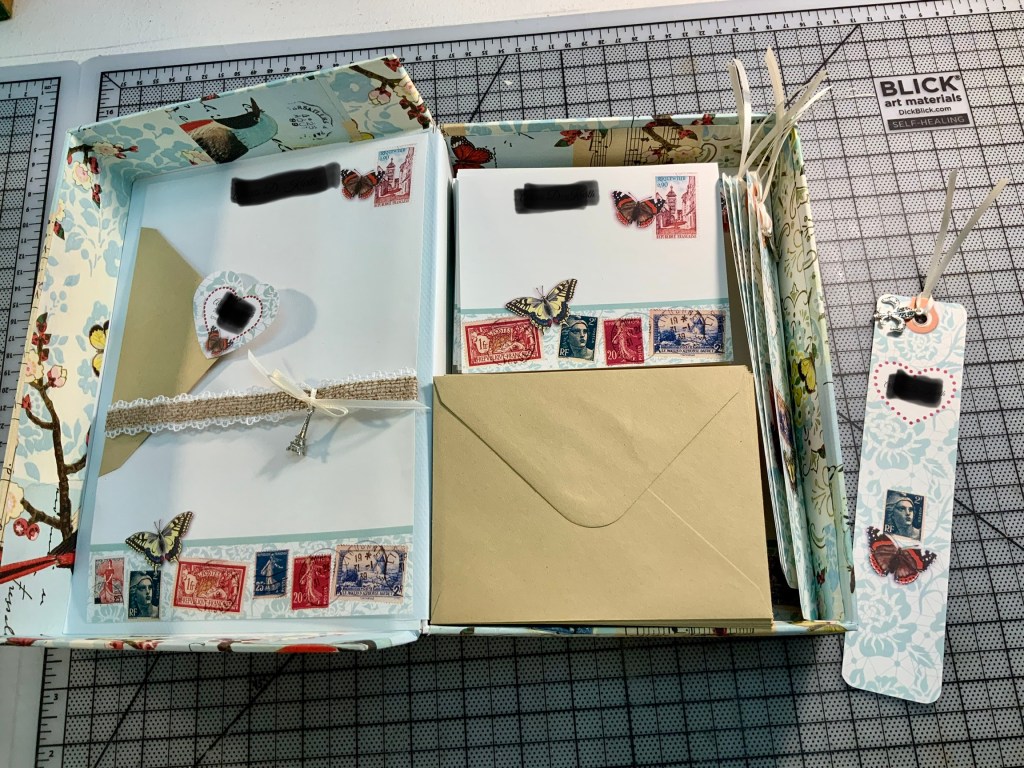 All the components were designed here in the studio and printed on our laser printer using materials we already had except for the envelopes. The box is an Ipad box covered with wrapping paper.