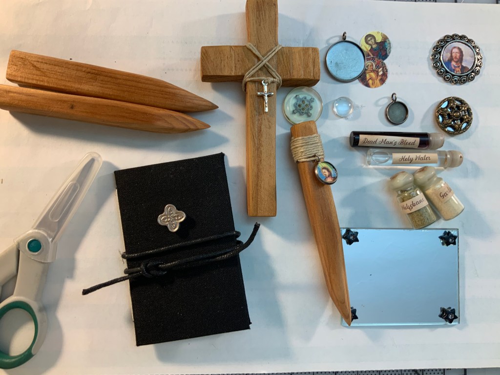 This wooden cigar box has been hanging around the studio for a while now waiting for inspiration to hit. A few minutes in the garage with some scrap wood yielded a cross and a couple of stakes. And some tiny bottles, jewelry blanks, and ephemera from the studio completed the rest.
